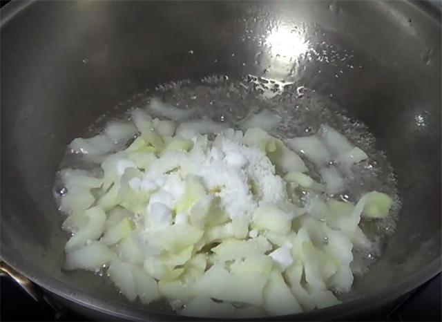 7.另起锅,加入一小碗水,然后把冰糖下锅,小火慢慢的把冰糖融化,然后倒入盐,再把柚子瓤倒入锅中,加入白糖不断的搅拌翻炒,柚子瓤会把糖水完全的吸收。