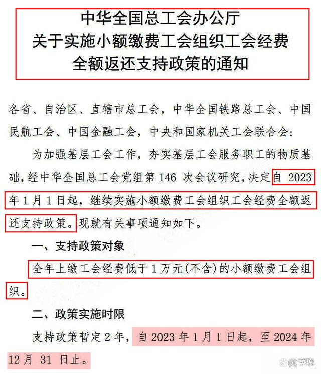 又有利好消息来了!根据《中华全国总工会办公厅关于实施小额缴费工会组织工会经费全额返还支持政策的通知》(厅字〔2022〕47号),对于全年上缴工会经费低于1万元(不含)的小额缴费工会组织,继续实施全额返还支持政策!