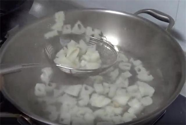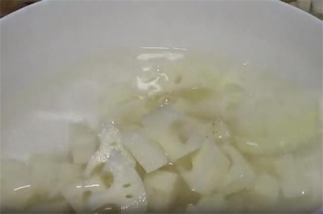 2.然后我们再把藕切成小块,切好之后,放入水中防止氧化。(www.ws46.com)