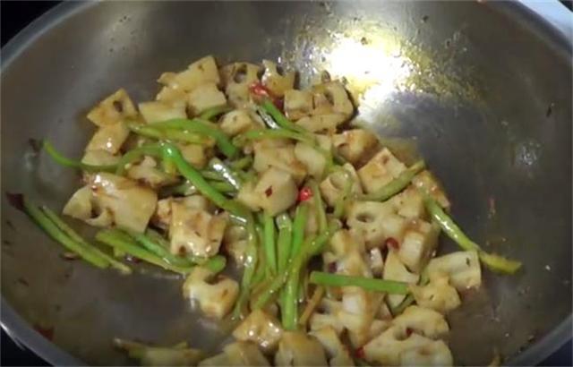 5.接着起锅加少量的油,然后下入葱姜爆香,再下入豆瓣酱炒匀,然后下入辣椒炒出辣味,接着下入藕丁翻炒均匀,炒匀后,淋入调好的汤汁,大火炒匀,再加适量的盐和味精调味,炒匀后就可以出锅了。