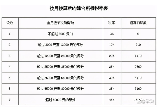 不过,降低中低收入群体的个税负担,并不是只有提高免征额一条路可以走,现行的个税提至里就已经有:专项扣除、专项附加扣除、个人养老金扣除等等税前抵扣的方式在实行,预计未来或也会考虑从这方面着手进行调整——比如增加专项附加扣除的项目,或者调整现有的抵扣方式,扩大综合所得范围等。 甚至,随着金税四期的上线,个税征管系统的完善,未来建立以家庭为单位纳税的个税纳税申报制度也不是不可能。以家庭为单位进行个税征收,其实是比较符合税收的量能负担原则,只是限于各种因素,目前无法实行。 不管怎样,个税改革的未来一定会沿着总体上降低中低收入群体的负担,加强高收入税收调节和监管力度的方向走,这一点不会变,未来中低收入缴纳的个税会越来越少也不会变。 最后,我们带大家简单算一下,大多数人月薪一万实际交税的情况: 假如小明月薪1万元,其中社保费、公积金等专项扣除为1000/月,专项附加扣除有子女教育1000元/月,住房贷款利息1000元/月,不考虑其他情况。那么小明需要交多少个税呢? 我们先算出应纳税所得额=10000-5000-1000-1000-1000=2000元。然后根据按月换算的税率表找到适用税率和速算扣除数。