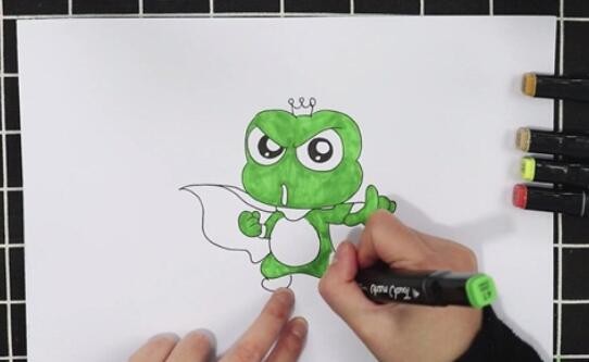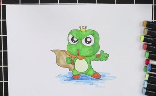 3、在青蛙王子的身后画上披风,并给它的身体涂上绿色。