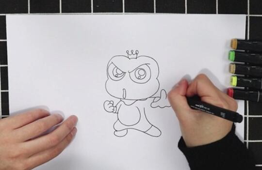 2、画出青蛙王子的身体,左右握拳,右手展开在前,双腿也是伸展开的。