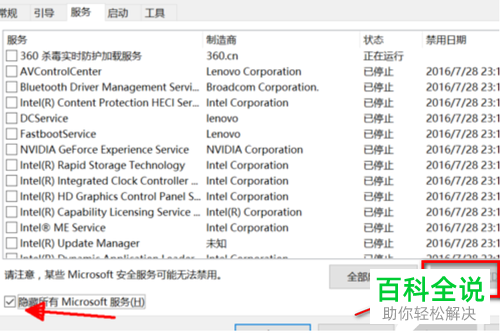 4. 第四步先点击顶部【服务】选项,接着根据下图箭头所指,勾选左下角【隐藏所有Microsoft服务】,然后点击【全部禁用】。