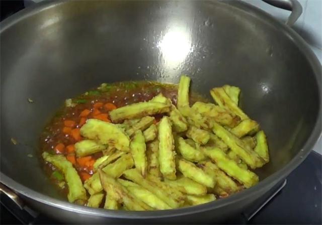 6.锅中留底油,倒入葱花炒香,再把胡萝卜下锅炒匀,再倒入调好的汤汁,大火煮开,然后把茄子下锅翻炒均匀就可以出锅了。
