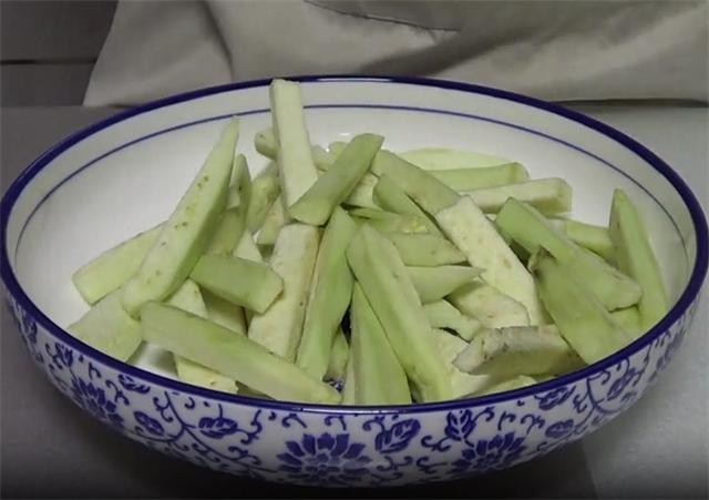 4.接着起锅,加入多一点的油,七成热的时候,把茄子下锅中火炸茄子,炸至表面泛黄捞出。