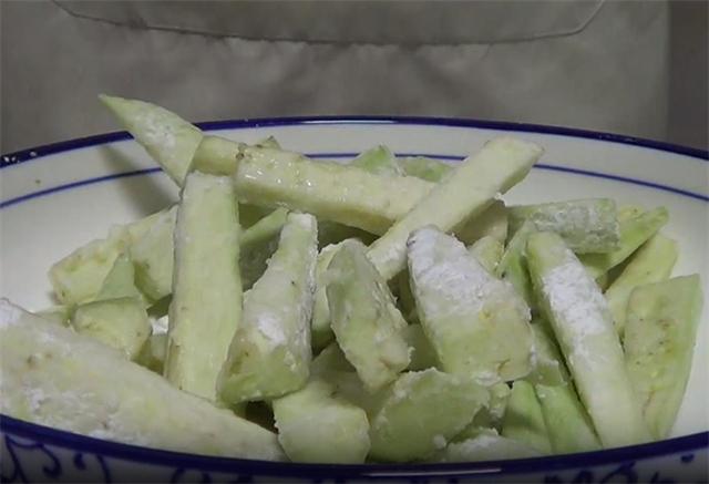 3.茄子烧好水之后,倒掉水分,加入适量的淀粉,搅拌均匀。