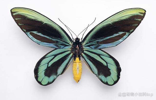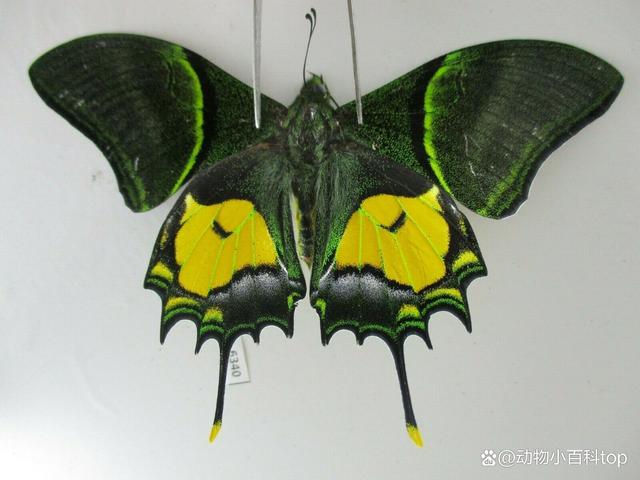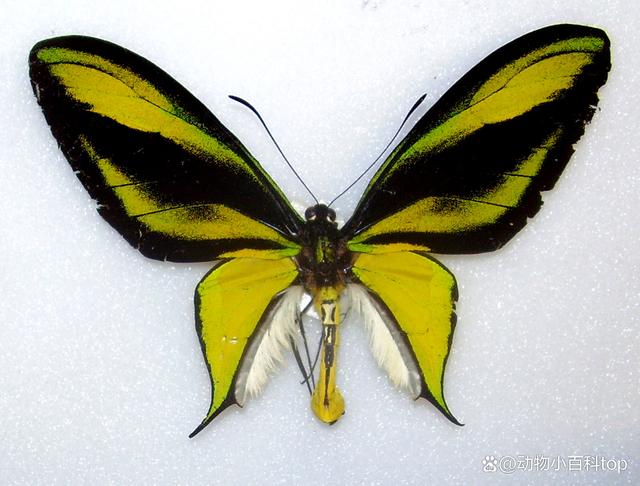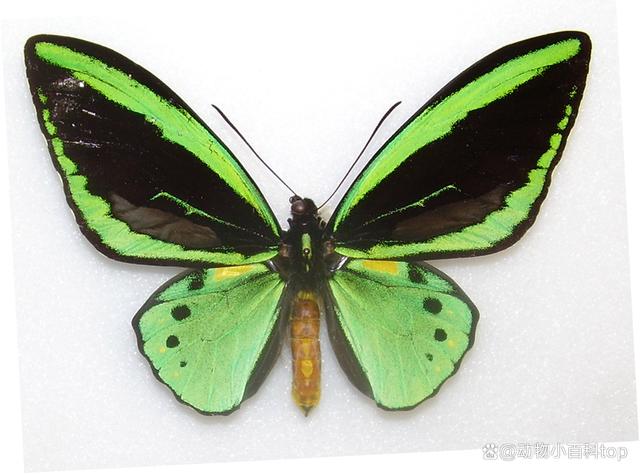 亚历山大鸟翼凤蝶是世界上体型最大的蝴蝶,该物种由罗斯柴尔德于1907年命名,以纪念英国国王爱德华七世的妻子亚历山大皇后(1844-1925)。它们仅在新几内亚东部的北部省份中分布。自1989年起,这种鸟翼凤蝶已经成为濒临灭绝的物种。由于其数量稀少,因此在黑市上具有极高的价值。亚历山大鸟翼凤蝶属于国际贸易公约下的《濒危野生动植物种国际贸易公约》所保护的物种,被归类为Ⅰ类濒危物种。 5、极乐鸟翼凤蝶