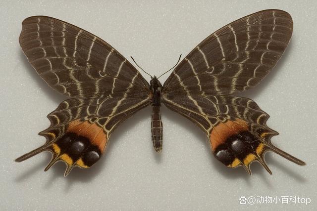 金斑喙凤蝶主要分布在中国的福建、江西、广西和海南等地区,有5个亚种。作为中国特有的珍稀品种,它被赞誉为"国蝶"和"蝶之骄子",也是世界上珍贵的蝴蝶之一。金斑喙凤蝶非常珍贵且稀有,是中国唯一一种被列为国家一级保护动物的蝶类,同时也被列为世界八大名贵蝴蝶之首,其被赞誉为"梦幻蝴蝶"和"世界动物活化石"。它的姿态优美,就像是一位华丽、高贵而光彩照人的"贵妇人",因此被尊称为"蝶中皇后"。曾经有人以百万的天价拍卖过这种蝴蝶,可见其珍贵程度。 2、双尾褐凤蝶