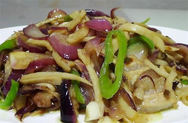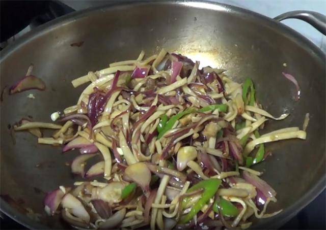 3.杏鲍菇蒸好之后,取出倒出水分,然后另起锅加入少量的油,下入葱花炒香,再下入洋葱和青椒翻炒均匀,把洋葱炒软,然后加入杏鲍菇,炒匀之后,加入适量的酱油,再加少量的素蚝油、盐翻炒均匀,出锅前加入少量的蒜末炒匀就可以出锅了。