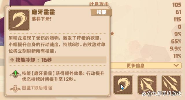 磨牙霍霍这个技能是有额外效果的,可以把行动提升状态持续的时间提高到12秒,这样在使用这个技能的时候,就可以长时间的获得移动速度加成的效果,并且要是击败敌方单位,还可以刷新全部技能。