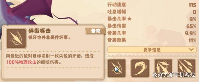 它是有一口尖利的牙齿的,战斗的时候会用碎齿啄击这个普攻技能,朝周围最近的敌对目标发射一枚牙齿,对其造成100%的撕咬伤害。