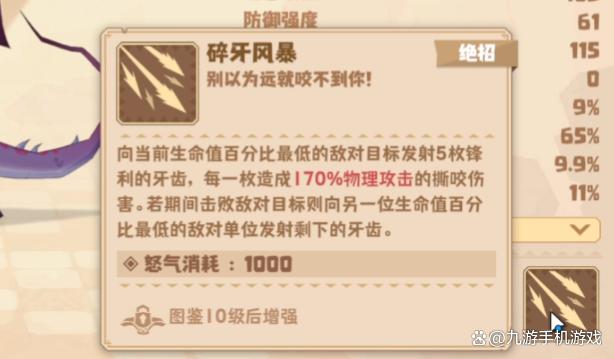 狩猎利齿是对普攻的强化,专门打生命值最低的敌人,发射3颗牙齿,每一个都是100%的物理伤害。大招就是碎牙风暴了,这次是强化到发射5颗牙齿,并且造成170%的物理撕咬伤害,要是击败了一名单位,剩下来的牙齿会找周围血最低的敌人进行攻击,实现精准打击。而且它所需要的怒气在同类大招当中并不算高,用起来性价比还是很高的。(www.ws46.coM)