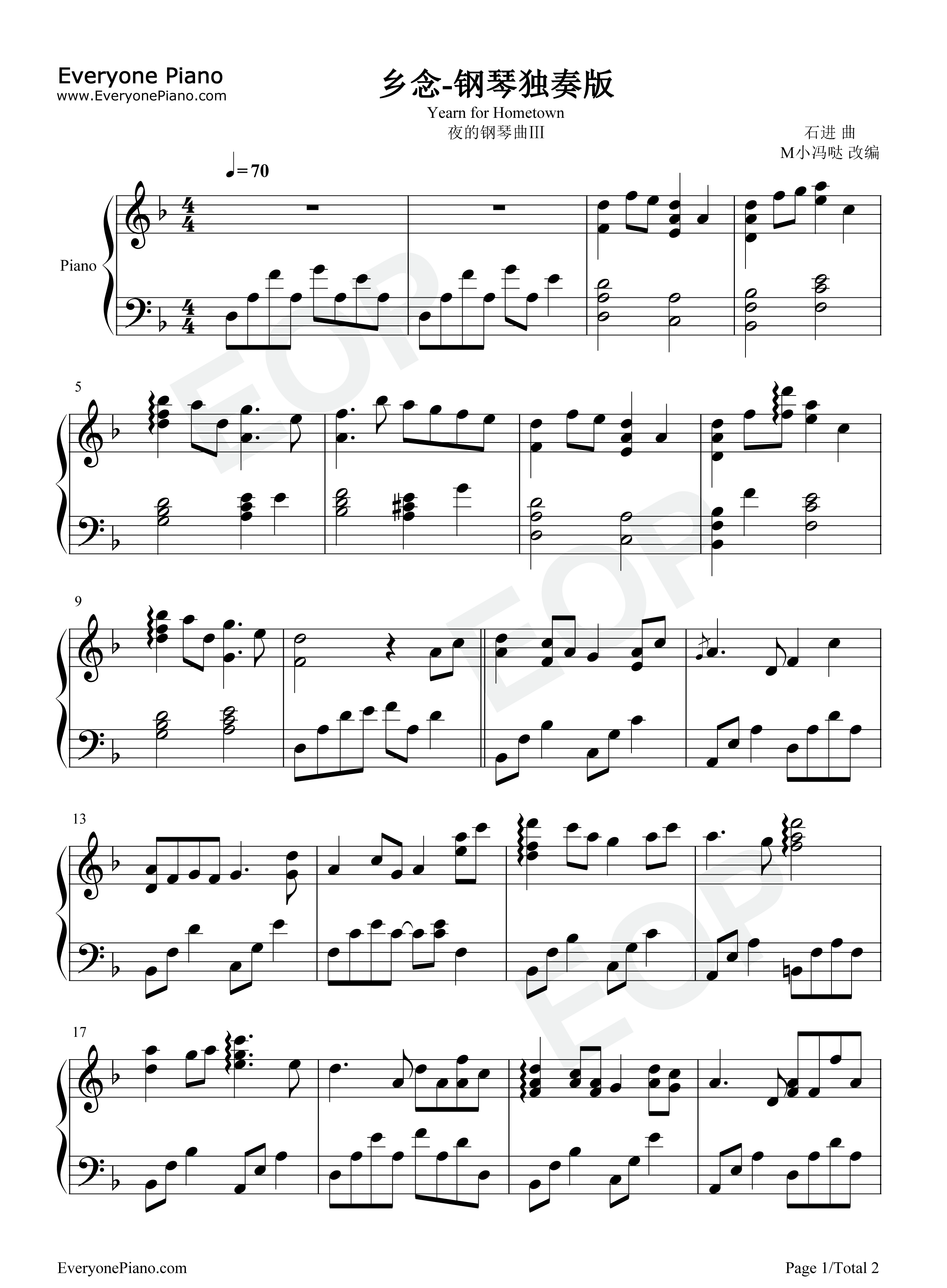 由EOP大佬M小冯哒给大家制作,曲子比较难,初学《魔鬼训练营》的小伙伴建议先行绕行哦! 《乡念》出自国内钢琴音乐创作演奏爱好者石进的钢琴曲集《夜的钢琴曲Ⅲ》。 世易时迁,时代不断的变化,人也不断的变化,但唯有不变的是出门在外的一颗思乡情。故乡是我们生长的根,是我们记忆的家园。它见证着我们的快乐,记录着我们的成长。正所谓莫说乡路长,再长也长不过我的思念;莫说天涯远,再远也远不过我的目光;莫说云天高,再高也高不过我的畅想。故乡,永远是人们心中永远的根。 |