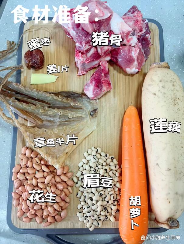 深秋已经到来,天气会越来越冷,阴凉的天气会让人亏虚,气血两亏,身体会非常乏力,影响到正常的生活。很多人上了年纪,很容易贫血,这个时候需要补充能量和气血,促进血液循环,让气色越来越好。秋季进补,补血是非常重要的时刻,可以给家里人尝一尝这款家常汤品——莲藕花生章鱼汤,几种食材煮一锅,汤品鲜美极了,不懂吃可惜了。气血不足,不要慌!建议多喝这汤,补血补气,脸色红润身体好!  【莲藕花生章鱼汤的制作技巧】 准备一些食材:挑选新鲜猪棒骨400克左右(猪棒骨是猪骨之一,骨头比肉多一些,里面全是丰富的营养和骨髓,经过焯水处理,搭配莲藕等食材煲汤,汤品非常鲜美),挑选新鲜莲藕300克左右,几个蜜枣,干章鱼半片,花生30克左右,眉豆25克左右,一根新鲜胡萝卜(胡萝卜是一种老少皆宜的蔬菜,色泽好看,营养价值全面,炖汤能够更大发挥营养价值,对我们的视力很有益处),一大块老姜,冷水足量,少许料酒,少许胡椒粉和食盐,其他。 详细制作过程: 1:提前准备好章鱼,猪骨,莲藕,胡萝卜和其他食材,先把胡萝卜的外皮清洗干净,用工具去掉外皮,切成一些滚刀块,放在一边备用。2:将莲藕提前洗干净,方便去掉莲藕的外皮,去掉外皮和藕节,全部剁成块状,莲藕特别容易氧化,可以用水浸泡,最后控干水分。 3:章鱼放在器皿里,加上适量温水泡发,撕掉最外面一层膜,切成大小相同的块状,或者焯水处理,控干水分,将锅底加上食用油,倒入章鱼块煸炒一会儿,翻炒均匀,盛出备用。4:几个蜜枣洗干净,生姜切片备用,猪骨都剁成块,用流水冲洗干净,把猪骨倒入锅中,加上姜片,葱段和料酒,将猪骨焯水处理,冲洗掉浮沫。 (www.wS46.com) 5:准备好炖汤的器皿中,放入章鱼块,猪骨,蜜枣,姜片,莲藕,胡萝卜,眉豆和花生,加上足量纯净水,调到大火炖煮,中途撇去一层浮沫。 6:转至小火炖煮75分钟左右,全部食材的营养煮出来,食材都炖熟了,加上一些白胡椒粉和食盐,焖煮几分钟即可,这道莲藕花生章鱼汤就烹饪完成了。 莲藕花生章鱼汤的食用禁忌:首先,章鱼作为海鲜类食材,对于海鲜过敏的人群而言,无疑是需要绝对避免的。一旦误食,可能会引发皮肤红肿、瘙痒,甚至呼吸困难等过敏反应,严重影响身体健康。其次,莲藕虽为温和之物,但因其具有清热凉血的功效,体质偏寒或脾胃虚寒者应适量食用,以免加重体内寒气,导致腹泻、腹痛等不适。特别是冬季,更应注意搭配温性食物一同食用,以平衡寒热。 综上所述,在享受莲藕花生章鱼汤的美味时,我们应根据自身健康状况,合理选择并适量食用,避免不必要的健康风险,让这道传统美食真正成为滋养身心的佳品莲藕花生章鱼汤是一款营养的汤品,里面包括猪骨,章鱼,莲藕,花生和眉豆,经过小火慢炖,营养价值价值高,汤品超级鲜美,喝起来很舒服,促进营养消化,气色越来越好。 各位网友们,你们是否掌握这款莲藕花生章鱼汤的详细做法吗?(本文均为原创,图片均出自网络)