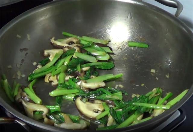 4.捞出后另起锅,加入少量的油,油热后下入葱花炒香,然后下入小白菜翻炒变软,再加入香菇炒匀,然后加入少量的素蚝油,炒匀后加入盐调味,再次炒匀就可以出锅了。