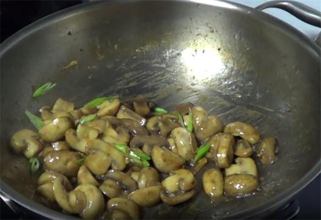 3.然后起锅加少量的油,油热之后加入葱姜炒香,然后加入口蘑,翻炒几下之后,加入少量的糖炒匀,再加入少量的酱油调味,炒匀后加入少量的水,然后一直炒至口蘑出汤变软,接着加入少量的盐调味,再加少量的水淀粉勾芡,炒匀后关火,加入少量的葱花,再次炒匀就可以出锅了。