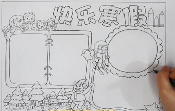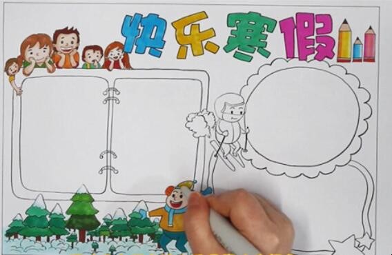 寒假可以说是每个学生都非常期待的长假了,不仅放长假还能过春节。下面一起来看看快乐寒假手抄报怎么画。 1、在手抄报的顶部写上主题“快乐寒假”,在主题的左侧画上五位小朋友,在右侧画上铅笔,下方画上一个花朵形状的边框,边框左下角画上滑雪的男孩。
