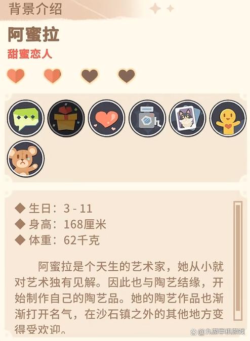 阿蜜拉是游戏内的居民,她一般都是在陶艺店出没,她是游戏里面的陶艺家,她来自巴那洛克。在游戏里面主要为玩家们提供陶瓷,血石等相关的物品。同时,她也是我们游戏之中可以攻略的角色之一,只要好感度够高,便可以触发个人剧情。