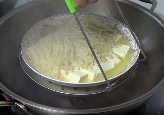 2.再把金针菇洗净之后,铺在豆腐上,然后入锅蒸十分钟,蒸好之后取出倒出水分。