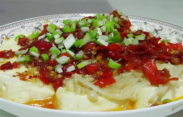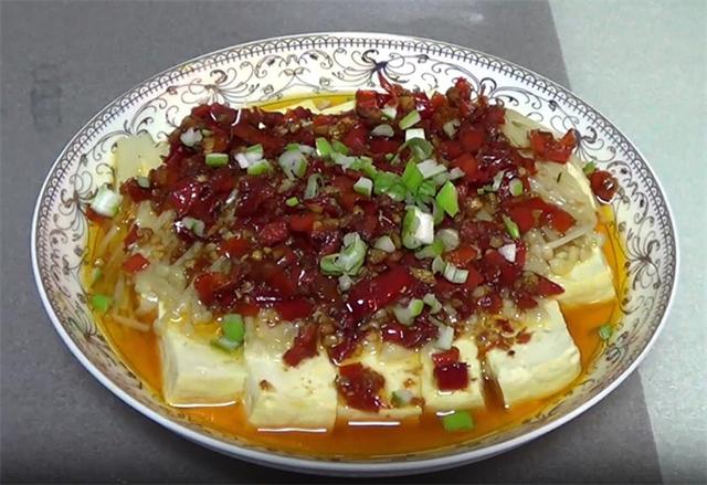 准备食材: 豆腐、金针菇、剁椒酱、食用油、蒜末、酱油、盐、葱花 具体做法: