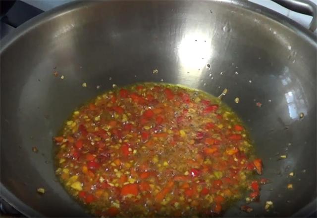 3.然后另起锅,加入少量的油,油热之后下入蒜末爆香,然后加入两勺剁椒炒匀,再加入少量的酱油调味炒匀,最后加入适量的盐。