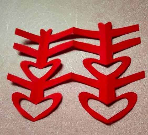 6、修剪完多余的部分之后,把它展开压平来。这样就是一个漂亮的桃心红双喜了。