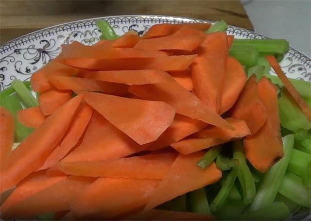 1.朋友们,大家好,今天我们来做一道素炒木耳,木耳脆嫩好吃,整道菜营养丰富很给力。准备一盘泡好的木耳,一根胡萝卜,一小把芹菜,把芹菜切段,胡萝卜斜刀切片,切好备用。