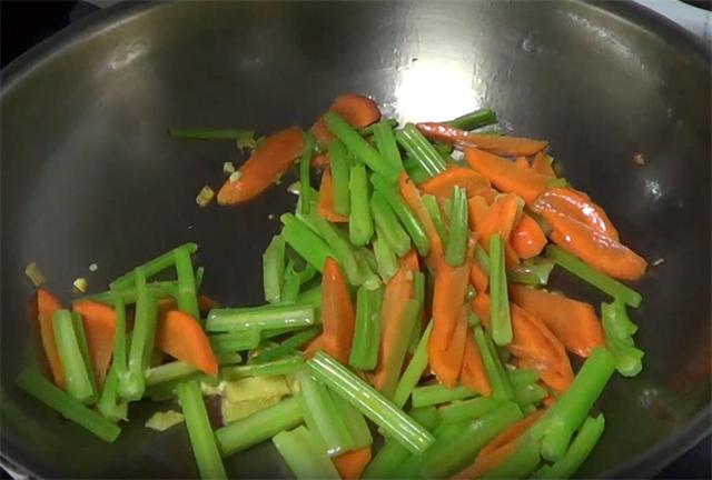 2.接着起锅加入少量的油,油热后下入葱姜蒜炒香,接着把胡萝卜和芹菜同时下锅翻炒均匀,炒至断生。