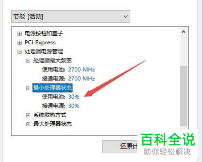 6. 然后将最小处理器状态设置为为CPU频率的30-50%,设置好之后,点击保存,最后重启电脑即可解决。