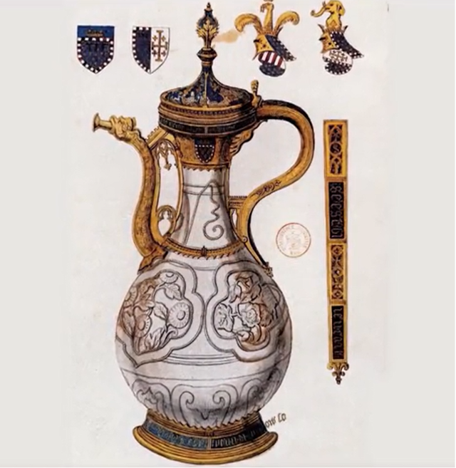 这张绘制于1713年前后的水彩画,则是丰山瓶曾经的模样,因此丰山瓶也被认为是传入欧洲最早,且流转记录最明细的中国瓷器,瓶身的空洞显示出被金属附近镶嵌的痕迹,也被证实是最早的金镶瓷,瓷器贸易走海商运输路途遥远,导致瓷器损耗率高,但中国瓷器在海外市场却价值连城。