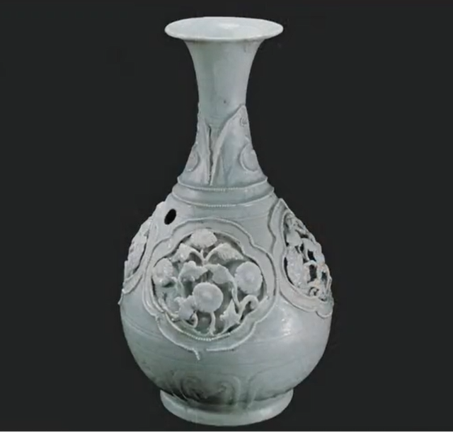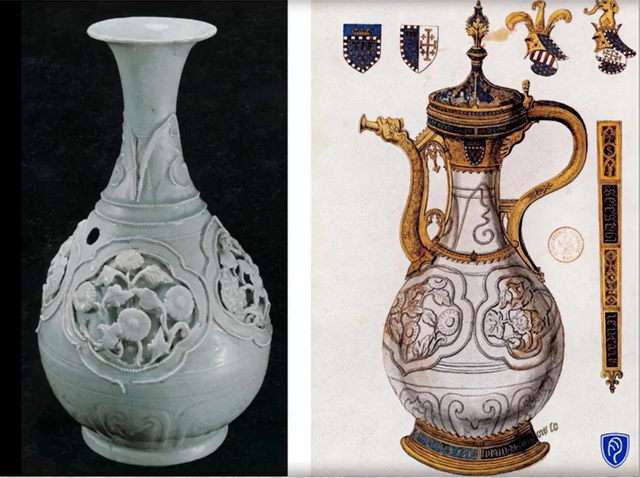 这一类在陶瓷上镶嵌金属材质被称作金镶瓷,不知道大家看到金属与陶瓷的结合是不是一头雾水,搞不懂老外把咱们外销过去的陶瓷这么改造到底是为了什么?让我们先来看这张图,这一件为14世纪元代景德镇青白釉玉壶春瓶,又名“丰山瓶”,现存于爱尔兰国家博物馆,该瓶最早由国王查尔斯二世收藏,而后多次易主。