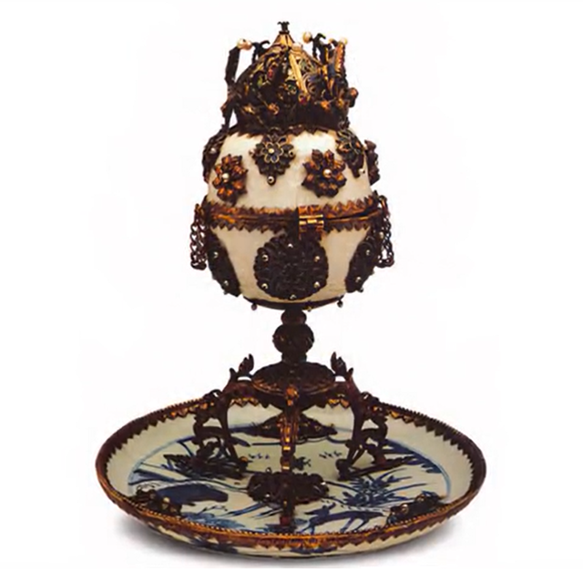 再来看这件青花熏炉,一对清代白釉小碗相扣,上方装上了镂空金属配件,满身的花瓣型配件还用珍珠点缀,底部则是一件金镶边的明代青花鹿纹碟,碗底和碟面钻孔,以四角金属支架固定碗碟,这些瓷器改装的细节散发出一股浓浓的豪气,以金属衬托主体的珍贵,也是欧洲镶嵌行为的传统。