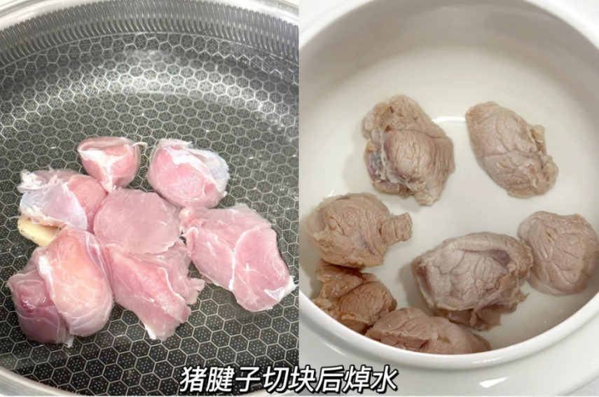 第四步:把陈皮提前泡发,猪肉去掉筋膜,洗净后切成小方块,瘦肉块放入锅里,加上姜片和葱段,加上足量的冷水,加上一勺料酒,把瘦肉焯烫去腥,冲洗掉一些浮沫,准备好苹果块和无花果,开始烹饪这道苹果无花果瘦肉汤。