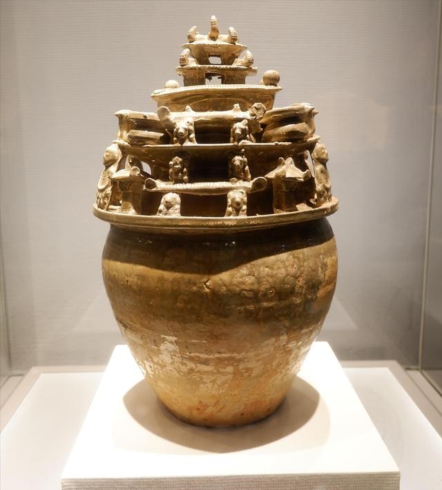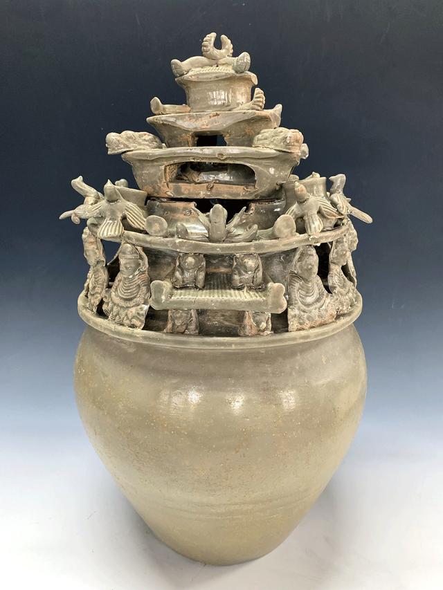 接下来我要介绍的是堆塑罐,这是用作陪葬冥器的越窑青瓷,也称为“谷仓”或“魂瓶,整体造型是现实生活的微缩版本,这一时期的人们真是太有创意了,许多实用器皿也被用作冥器,其中不乏有趣的仿生造型,真是让人叹为观止。