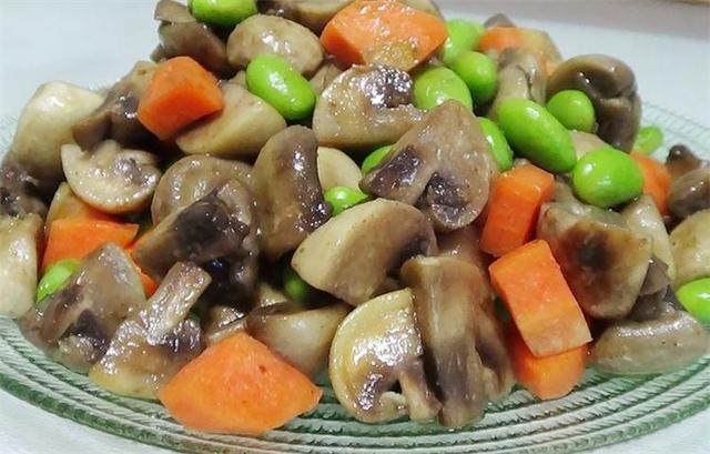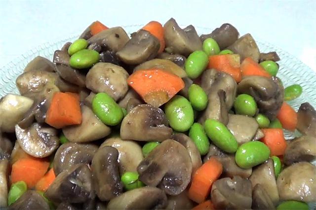 准备食材: 青豆、口菇、胡萝卜、大蒜、食用油、清水、盐、白胡椒粉 具体做法: