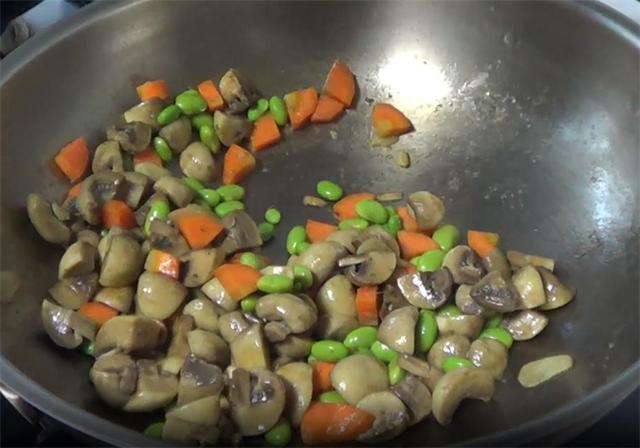 4.再另起锅,加入适量的油,油热后下入蒜,倒入口菇炒匀,再加入少量的水继续翻炒,然后下入胡萝卜炒至断生,再把青豆下锅,炒匀后加入适量的盐和白胡椒粉,再次炒匀就可以出锅了。