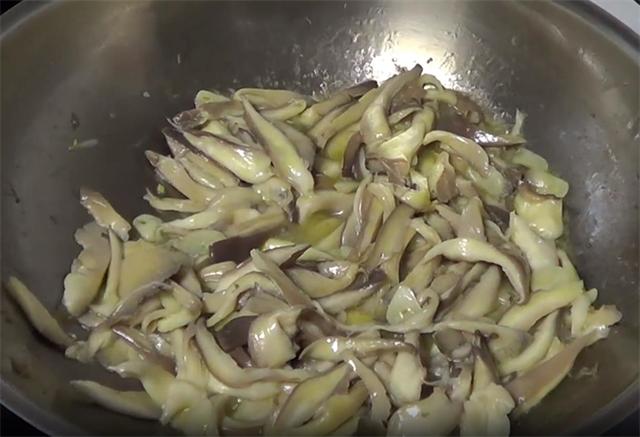 2.撕好之后起锅,加入适量的油,油热后下入蒜,接着把平菇下锅翻炒均匀,让平菇把油吸干净,然后加入适量的盐,继续翻炒,平菇的水分会逐渐的出来,这道菜的重点就是不断的翻炒。