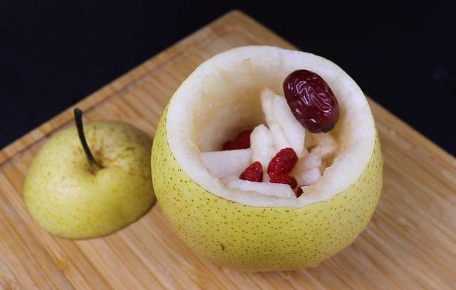 脾胃好的,生着吃,榨成梨汁都十分不错,不敢吃凉,脾胃比较弱的,可以试试这道川贝蒸梨,秋天吃正合适。 拿一粒川贝用擀面杖擀成粉末,一次不要加太多,倒入梨盅内,再加几颗冰糖,红枣和枸杞来调和味道,加入一点清水,和梨盅口齐平,最后盖上盖子,用牙签固定。