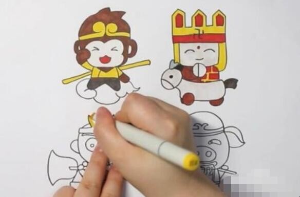 6、给沙僧与猪八戒也上好颜色,西游记师徒四人的简笔画就完成了。