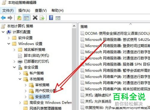 3. 如图,在打开的本地组策略编辑器页面,左侧依次展开计算机配置/Windows设置/安全设置/本地策略/安全选项的菜单项。