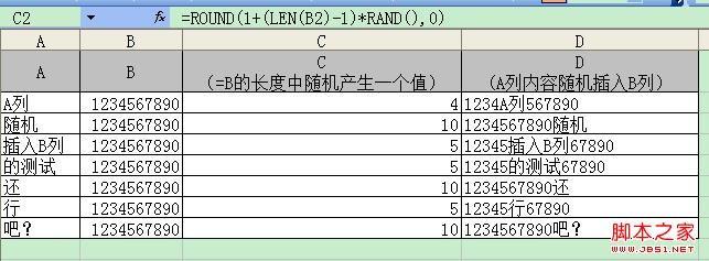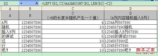 解决步骤: 1.求B列内容长度 = LEN(B列内容) 2.根据B列长度产生一个随机值,例如B列长度为10,产生一个1~10的随机值(www.ws46.cOm) = ROUND(1 (LEN(B列内容)-1)*RAND(),0) 3.将A列内容插入B的随机值位置 =LEFT(B列内容,B列随机位置) & A列内容 & RIGHT(B列内容,LEN(B列内容)-B列随机位置)