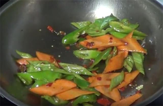 2.接着起锅加入少量的油,油热后加入一大勺的剁椒酱,炒出辣味,然后加少量的酱油调味,接着下入青椒和胡萝卜翻炒均匀。