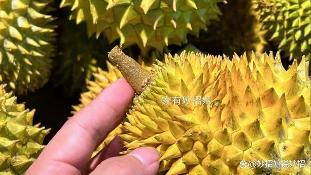 第四:手柄越粗皮越薄。 在榴莲的顶端都会留有一截手柄,在买榴莲时,我们就要记得观察一下这个手柄。一般来说,差不多大小的榴莲,如果它的手柄越粗,就说明果皮就越薄,里面的果肉自然也就越饱满了。这是因为手柄的粗细与榴莲在生长过程中吸收的养分和水分有关。手柄粗的榴莲,通常表示着在生长过程中得到了更多的营养,从而果肉更加饱满。相反,手柄细的榴莲,果皮往往较厚,果肉也比较少。
