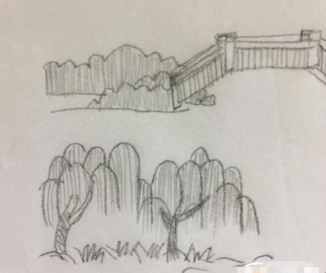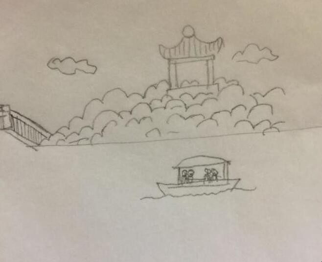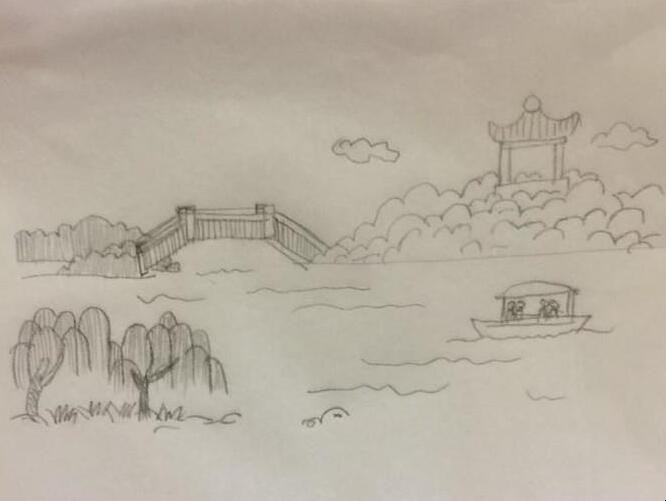秋天就要离开,公园的风景虽然已经不如夏天那么郁郁葱葱但是秋高气爽很让人心旷神怡。那么公园简笔画怎么画呢? 1、在a4纸上画出一个凉亭,如下图所示。凉亭的画法就是画出一个类似于金元宝的形状作为凉亭的屋顶,之后画出四条平行的直线作为凉亭的柱子就可以了。 ![]() 2、在凉亭的下方画出一些波浪线作为森林,在凉亭的上方画两朵正在移动的云朵,如下图所示。 ![]() 3、在树木的左侧画出一座拱桥,如下图所示。在画这部分的时候,可以参考两倍的凉亭宽度。 ![]() 4、在拱桥的对面画出几棵柳树以及树下的小草,如下图所示。(www.Ws46.com) ![]() 5、在湖面上画出一艘小船以及船上的小人,如下图所示。 ![]() 6、在湖面上轻轻勾勒一些线条作为水的波纹就可以了。 ![]() 以上就是给各位带来的关于公园简笔画怎么画的全部内容了。 |