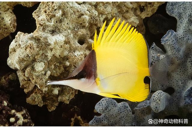 白天,鹦嘴鱼皇后(Scarus vetula)是一种美丽而对潜水员友好的珊瑚鱼。然而,到了夜晚,它会转变成一个隐居的粘液袋。在日落时分,这种鱼会滑入缝隙中,利用位于鳃后的特殊腺体分泌粘液泡,这些泡泡就像潜水头盔一样膨胀到鱼的头部。同时,口袋会向鱼的尾部扩展,大约30分钟后,鱼就可以在一个非常宽敞的粘液囊中休息了。这种适应性使其值得在最奇怪的鱼类名单上占有一席之地。 7、黄色长鼻蝴蝶鱼