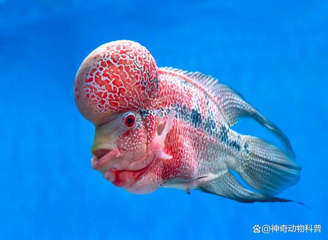 如果每张脸都能讲述一个故事,那么这张脸可能会讲述一则关于高尔夫球掉入池塘的悲伤故事。然而,在这里并没有发生过什么悲剧性的体育事故。这种属于丽鱼科的花角鱼具有巨大肿胀的前额,被称为颈驼峰,这一特征似乎与吸引求偶伴侣有关。