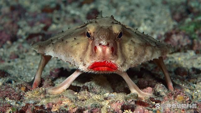 这家伙到底是属于动物、植物还是矿物?即使你试图回答这个问题,它的毛皮和移动的腿也可能会令你感到困惑。毛躄鱼和其他琵琶鱼一样,通过在背鳍的改良脊椎末端摆动像蠕虫一样的诱饵来引诱猎物。好奇的受害者会被捕食者张开大嘴时产生的水流吸走,这个张大的嘴巴可以容纳比躄鱼本身还要大的猎物。 更让人惊讶的是,四个胸鳍和腹鳍经过改造,使这种奇怪的鱼能够在海底爬行。根据所在栖息地的不同,这种奇特的鱼有着黄色、红色、黑色、白色、斑点和条纹的各种形式。它们的发型也各具特色——尖尖的发型被认为是为了模仿海胆。 10、红唇蝙蝠鱼
