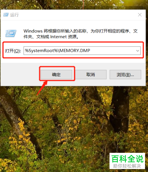 6. 最后按下【Win R】快捷键打开【运行】窗口,在方框中输入复制的转储文件,接着根据下图箭头所指,点击【确定】选项即可。