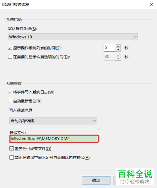 5. 第五步在弹出的窗口中,根据下图所示,先复制转储文件【%SystemRoot%\MEMORY.DMP】,接着点击【确定】选项。